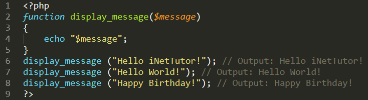 display_message ("Hello iNetTutor!"); // Output: Hello iNetTutor!