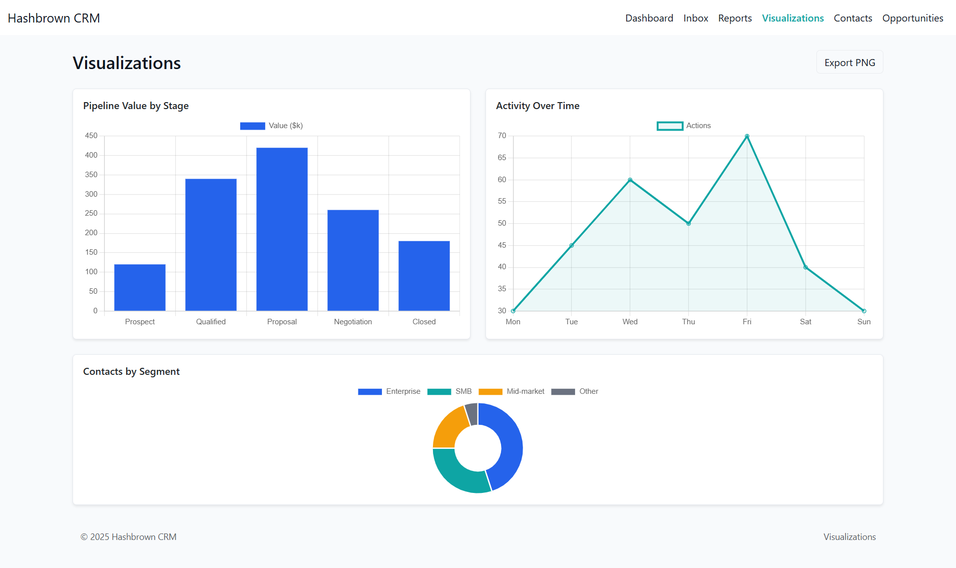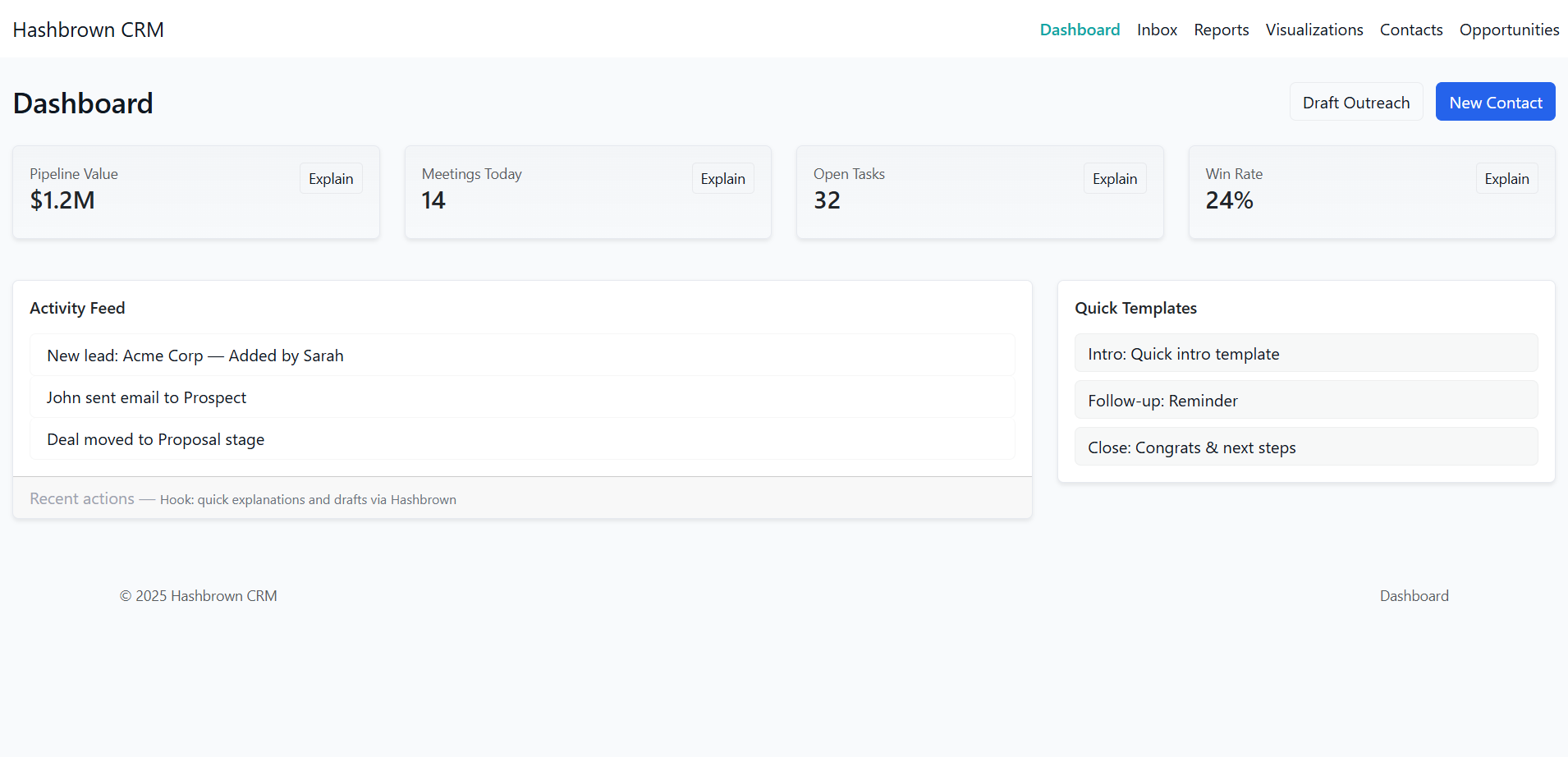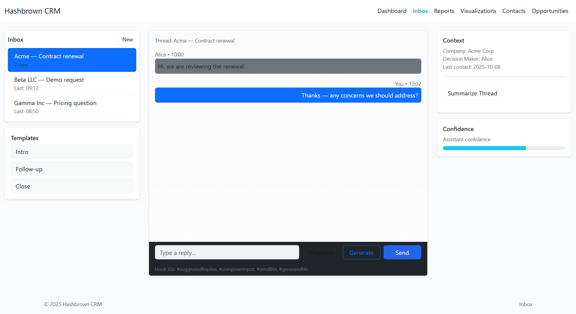 - Automate UI Generation: Utilize Hashbrown to dynamically create CRM interfaces such as customer dashboards, contact lists, and analytics pages.